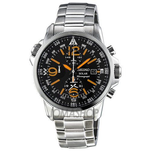 Stainless steel case with a stainless steel bracelet. Fixed stainless steel bezel. Black dial with orange hands and orange index hour markers. Arabic numerals mark the 6, 9 and 12 o'clock positions. Minute markers. Compass scale. 360 degree scale around the outer rim. Dial Type: Analog. Luminescent hands and markers. Date display at the 3 o'clock position. Chronograph - three sub-dials displaying: 60 second, 60 minute and 12 hour. Quartz movement. Scratch resistant Hardlex crystal. Pull / push crown. Solid case back. Case diameter: 41 mm. Case thickness: 11 mm. Round case shape. Deployment clasp with push button release. Water resistant at 100 meters / 330 feet. Functions: chronograph, date, hour, minute, second. Casual watch style. Watch label: Swiss Made. Seiko Black Dial Stainless Steel Mens Watch SSC077.